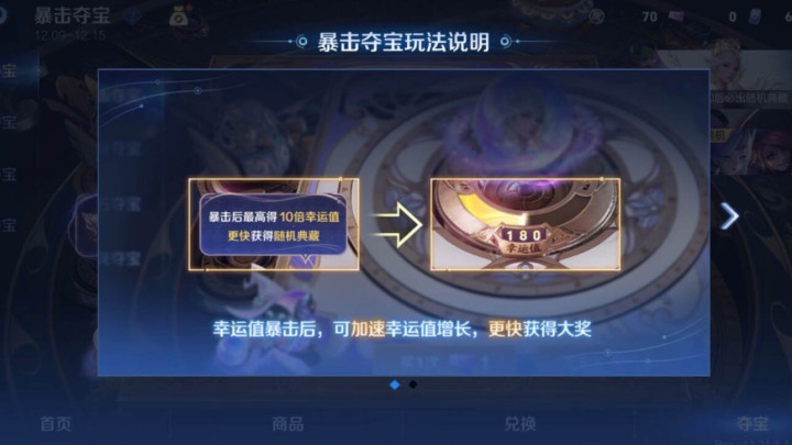 此外还有积分夺宝也新增了一种抽奖方式,叫做暴击夺宝。和传统的积分夺宝相比较,暴击夺宝的不同主要体现在幸运值上。