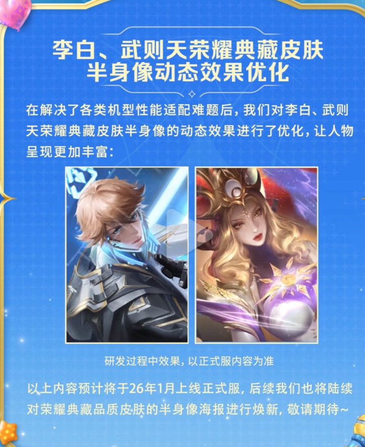 官方称这两款皮肤的优化预计会在明年一月份上线正式服,并且还称后续会陆续对荣耀典藏皮肤品质的半身像海报进行优化。