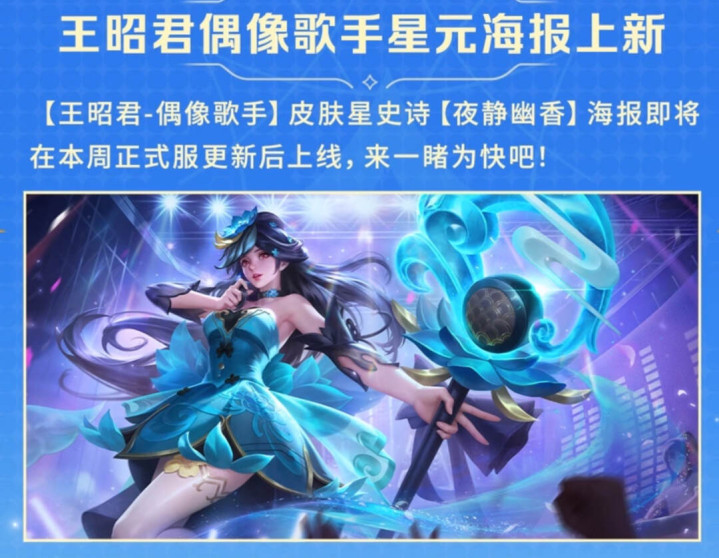 如下图所示,近期王者荣耀官方发布了公告,称王昭君偶像歌手的星史诗夜静幽香,推出了一套海报。