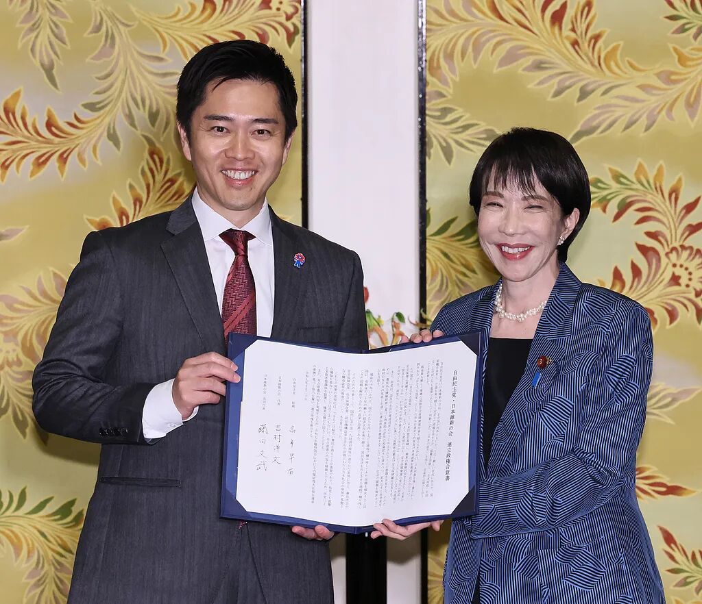 此后,高市早苗展开一系列斡旋活动,争取到了众议院第三大党——日本维新会的支持。10月20日傍晚,高市早苗与日本维新会代表吉村洋文签署了关于两党联合执政的协议文件。此次维新会将以“阁外合作”的形式参与联合执政,即其成员不进入内阁,仅由其国会对策委员长远藤敬出任首相辅佐官。