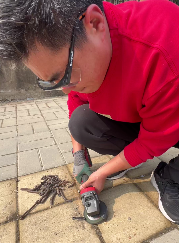 张玉帅的工具不断升级:从砖头到羊角锤,再到网购的角磨机。而真正的挑战很快出现——一个直径30厘米的不锈钢防撞柱残桩,只露出地面3厘米。“围着它转圈切,火星子溅得满胳膊都是。”那天他用了十多个切割片,蹲着忙活了大半天。