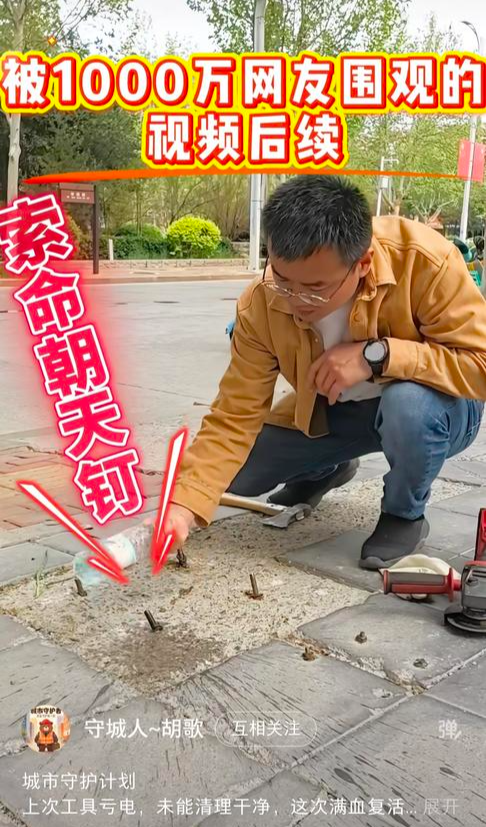 在聊城,胡先生的觉醒同样始于切肤之痛。三件事推着他走向街头:车胎被扎、自己差点绊倒,以及3岁女儿眉头被磕伤。而最后那下“推力”,是网上偶然刷到的视频——“原来清理路面钉子,普通人也能干。”